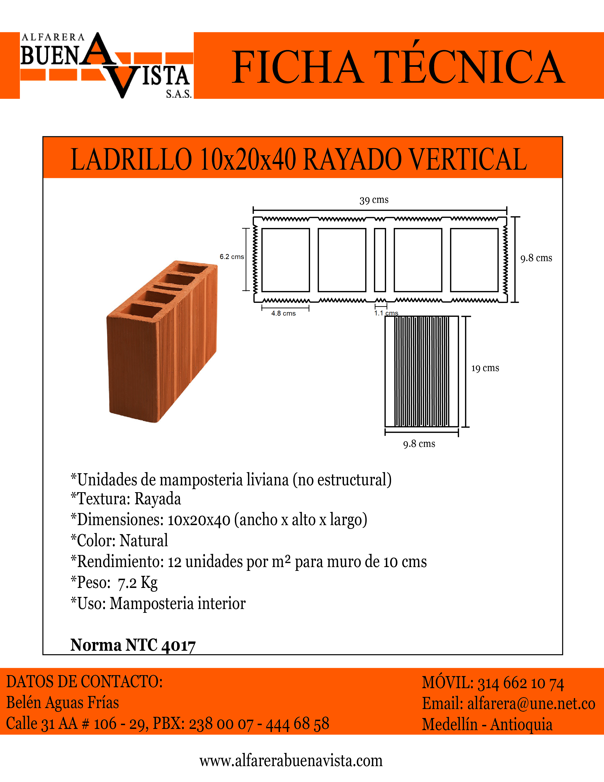 Rendimiento: 12 unidades por m² para muro de 10 cms