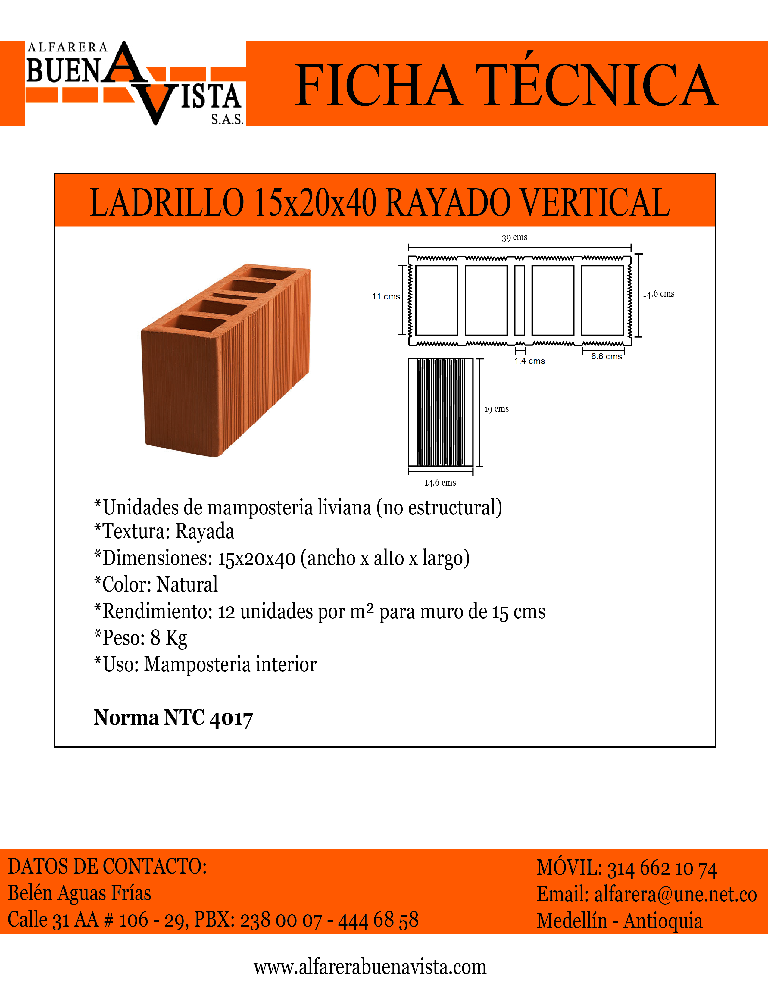 Rendimiento: 12 unidades por m² para muro de 15 cms